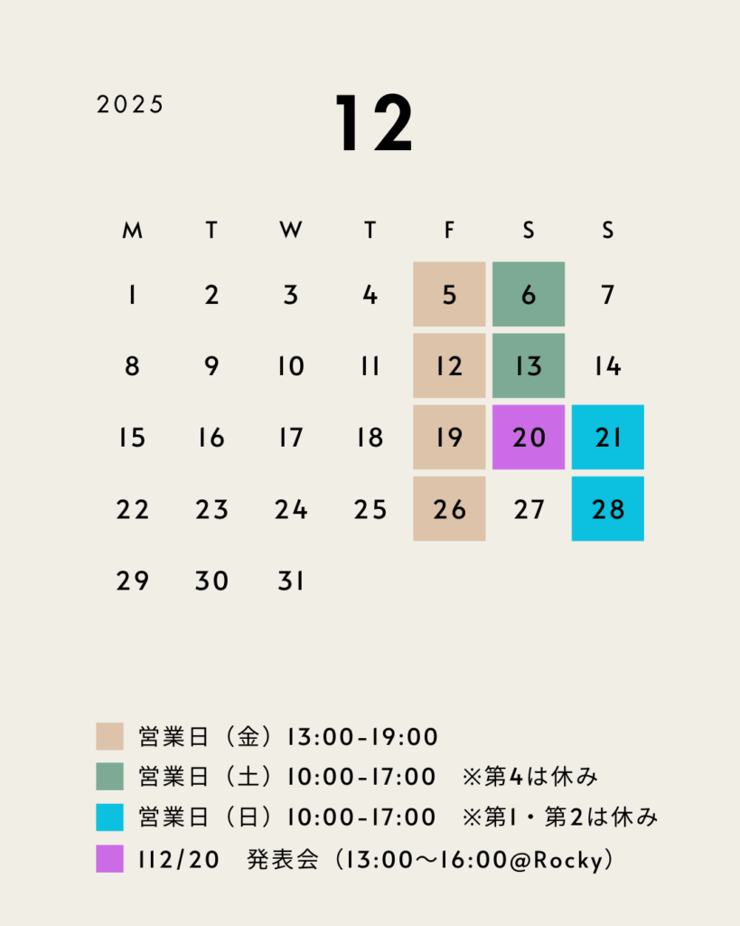 | 営業時間 | 金曜日:13:00~19:00 土曜日:10:00~17:00(第4土曜日休み) 日曜日:10:00~17:00(第1・第2日曜日休み) ※営業時間は臨時で変更になる場合があります。 |